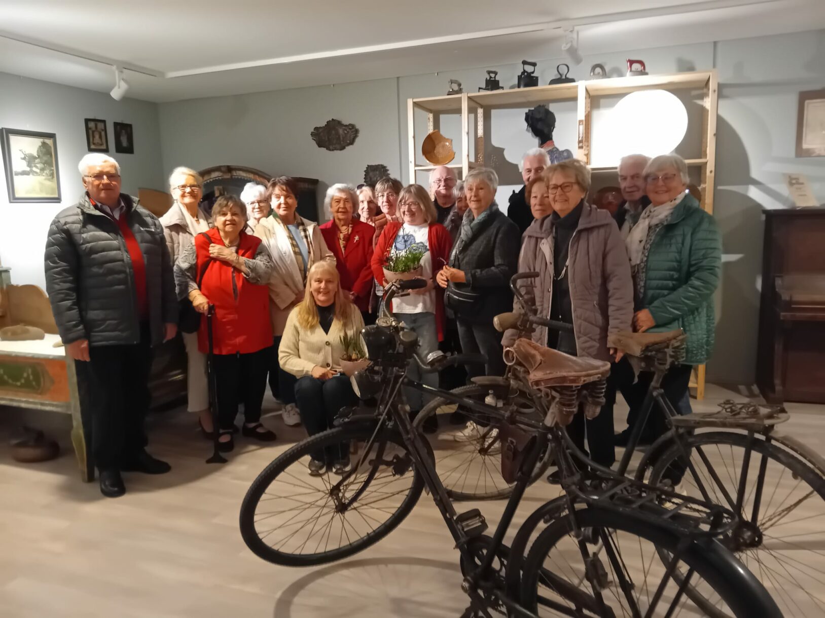Die Seniorenunion Haimhausen besuchte das Heimatmuseum in Haimhausen. Frau Niedermeier und Frau Kolbe, die guten Geister des Museums, führten uns in die Vergangenheit ein, vom uralten Radl bis zur Milchzentrifuge, von der Registerkasse bis zur Schulbank und Stühlen aus unserer alten Schule mit Setzkasten, Federhalter und Schulbüchern aus der damaligen Zeit. Alte Möbel, Gemälde vom Haimhauser Künstler, Herrn Max Bergmann und viele andere Dinge weckten unser Interesse. Nachdem wir uns bei beiden Frauen bedankt und verabschiedet hatten ging es weiter zum Mittagessen und gemütlichen Zusammensein.